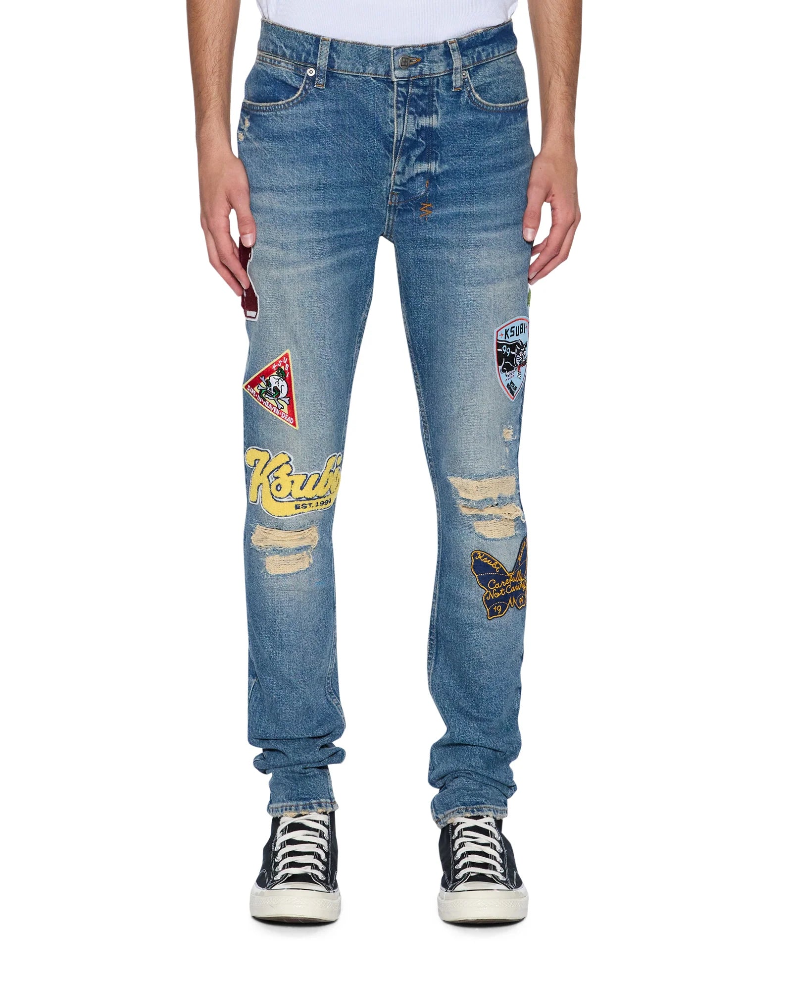 The Van Winkle Rodeo Patched is a mid rise five pocket full length skinny jean. Made from a premium comfort stretch indigo denim with a heavy stone wash, it is constructed with unique angled belt loops and front fly seam detail. Featuring seasonal embroidery on the front and back of the garment, finished with T-box and 4x4 embroidery, ghost patching detailing, and Ksubi branded hardware.