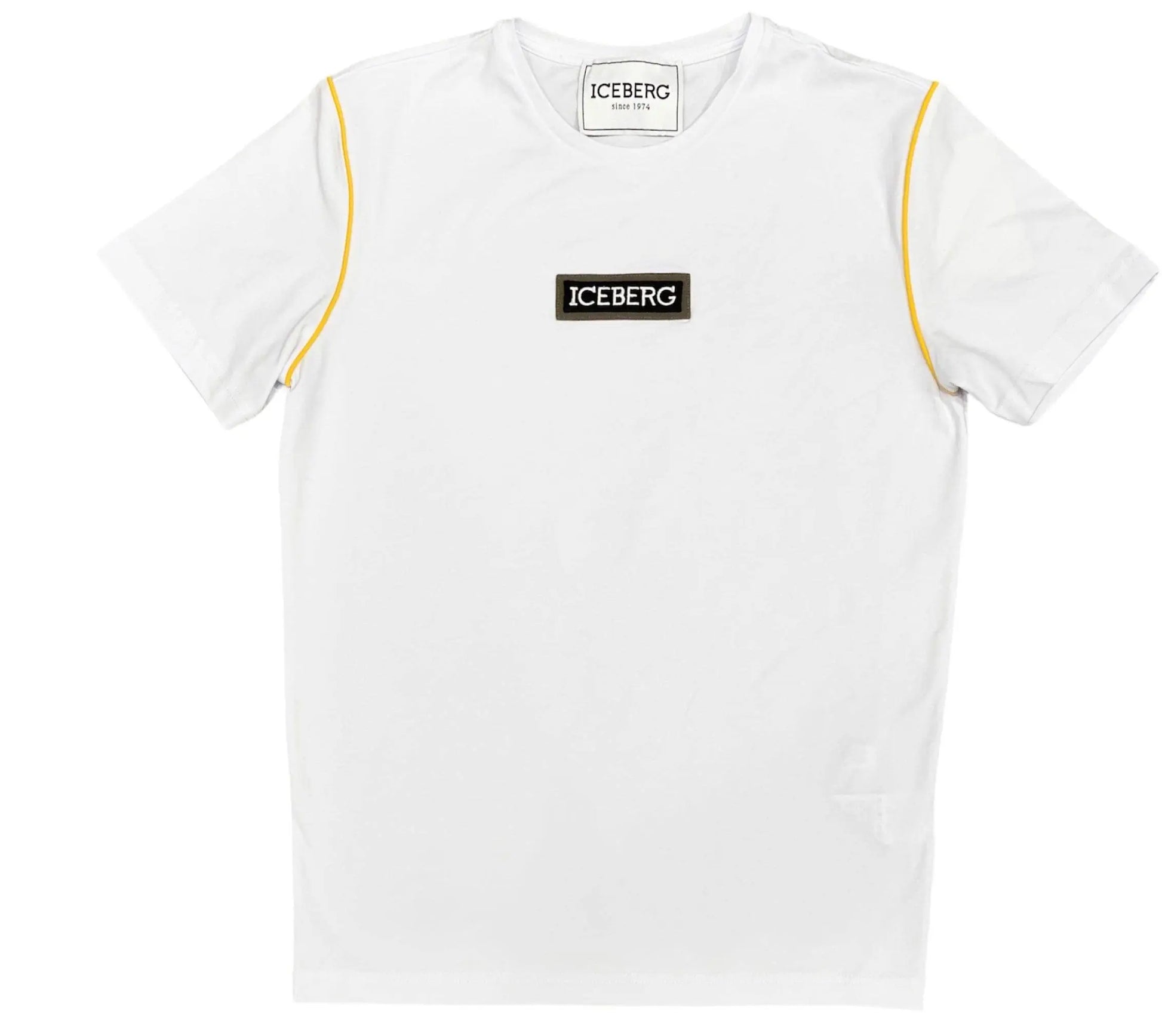 Men's White Iceberg T-shirt. 100% cotton. Round neck. Slim fit. Rectangle Iceberg logo in gray and black with contrast white lettering on chest. Plain. Back. Contrast yellow piping detail on shoulder seams. Seamless detail.